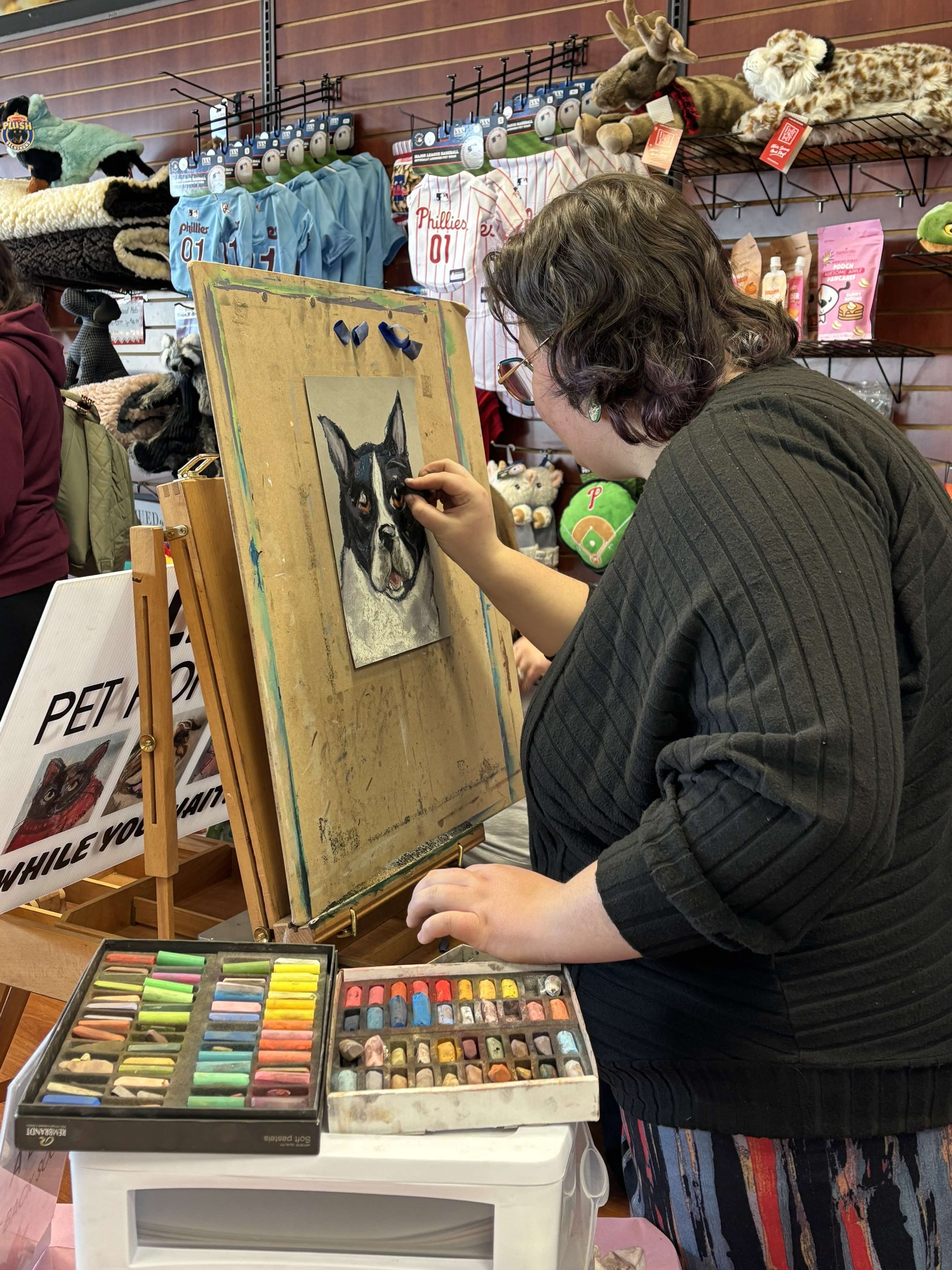At events, festivals, markets, and more, Spotted Lillies Studio’s live portraits are an exciting opportunity to commemorate your pet while watching an artist work! These sketches are an affordable alternative to standard portrait commissions, as they prioritize speed over quality. In under 15 minutes, Lillie can capture your pet’s essence in a colorful expressionistic pastel drawing.
