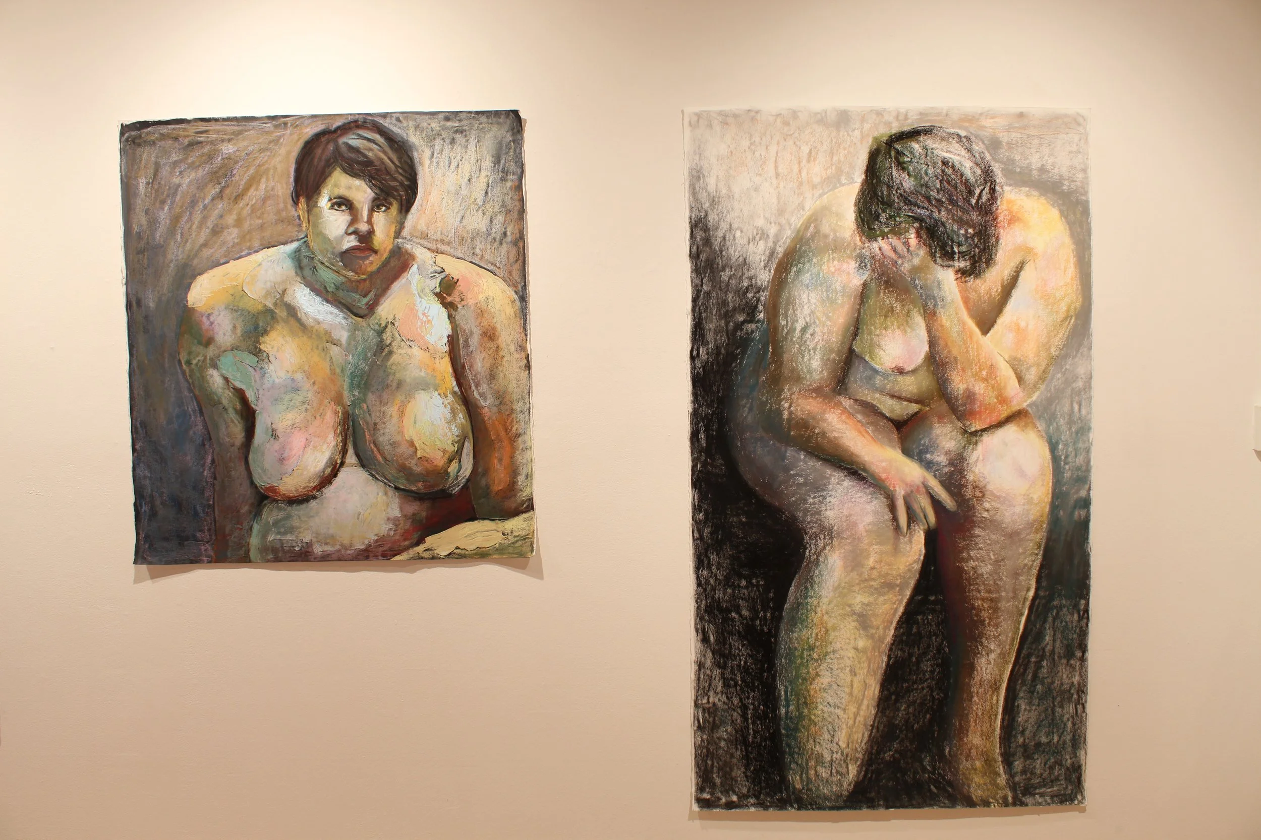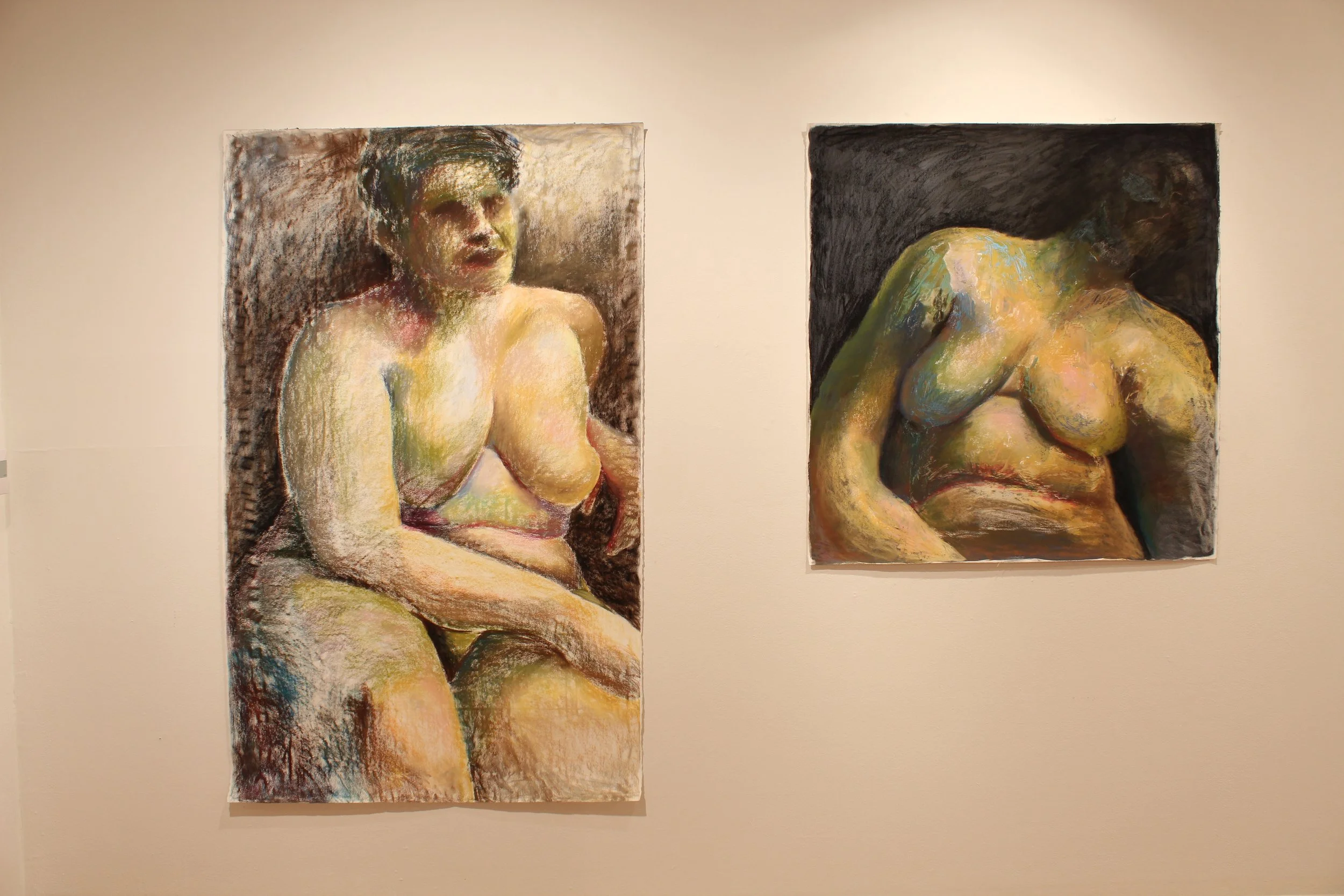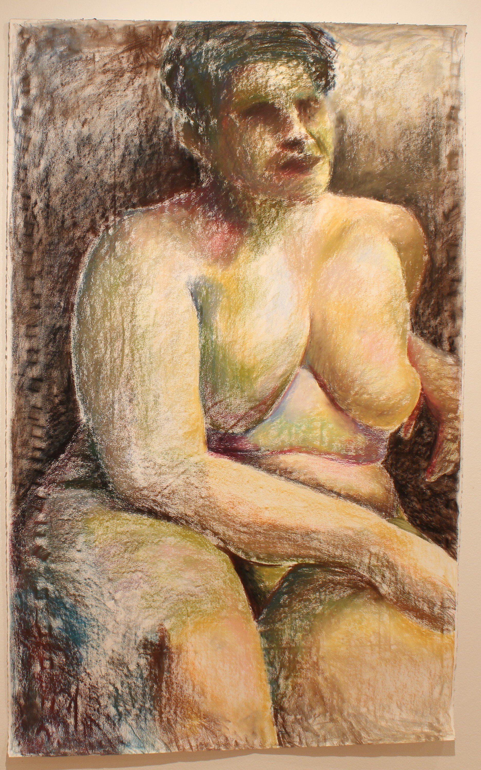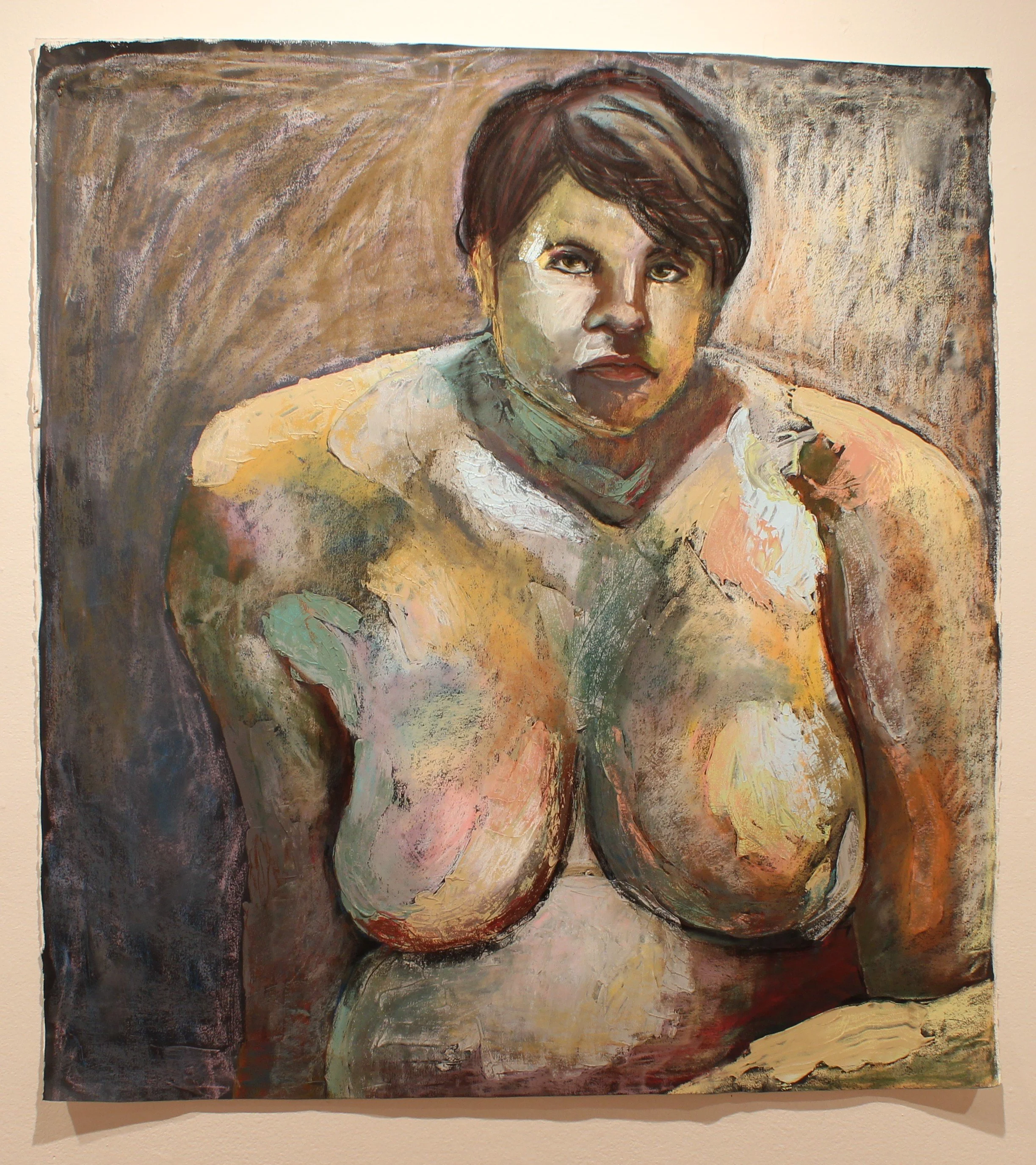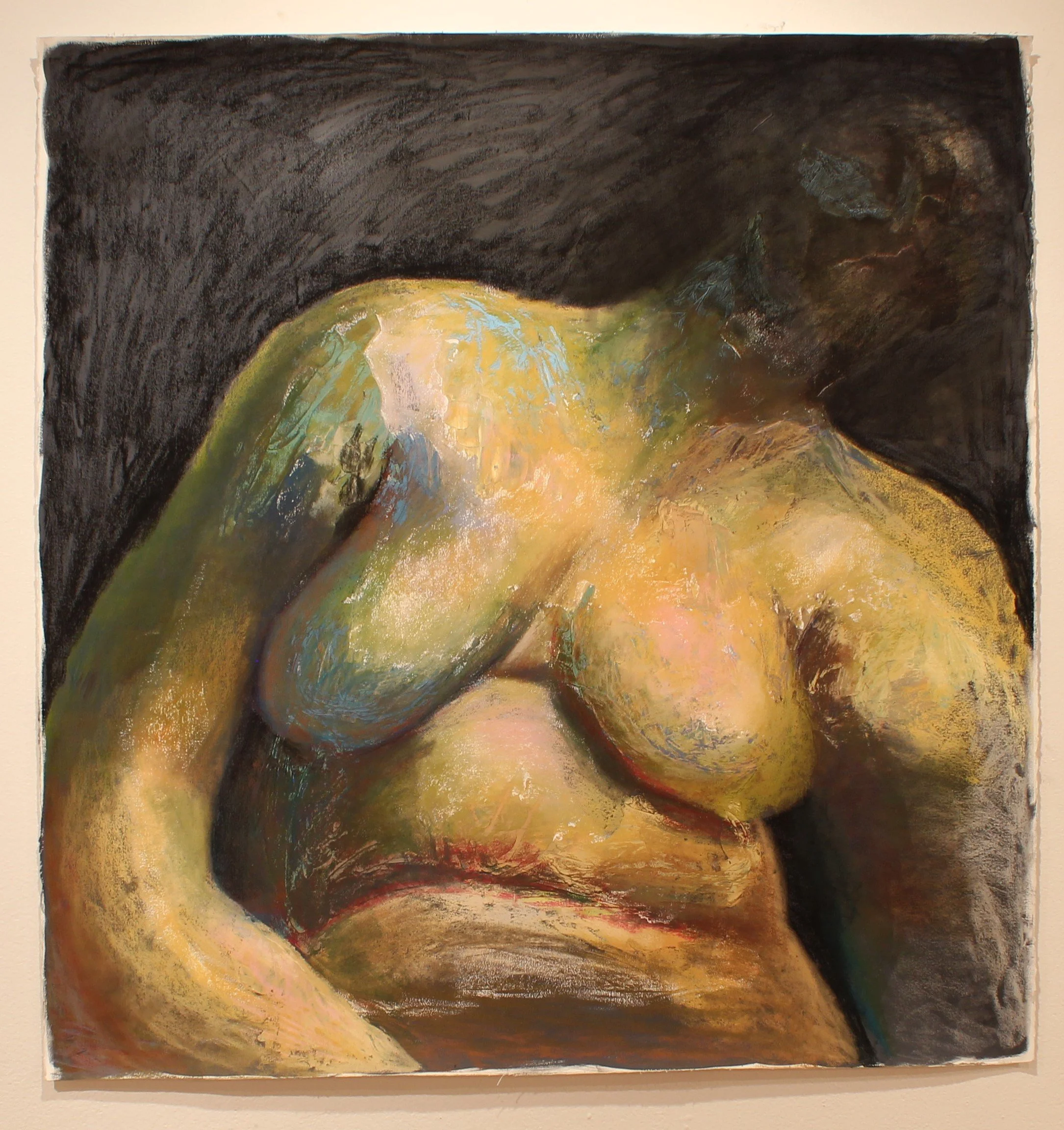 I reject the tradition of the male voyeur in depictions of the female nude. Through a consideration of my own figure and using nude self-portraiture, I examine how my gender expression has impacted my self-perception and societal perceptions of me. Inspired by historical artists like Suzanne Valadon and their representations of women that include self-portraits, I aim to reclaim the power of the female body by presenting my own form as an object to be experienced rather than looked at. Like the contemporary painter Jenny Saville, I choose to work on a large scale to create an unavoidable and uncompromising visual experience. I incorporate variations of my own gaze in the mirror to represent the complexity of the relationship I have with my own image and how it is perceived. Because of the emphasis on the life of the body, my process for producing these works is important to the overall meaning behind them. Applied with a palette knife I use a combination of thick acrylic paint layers and thinner layers of soft pastels to slowly build up veils of texture on the paper’s surface, creating a physicality which requires a process reminiscent of constructing my own identity and forming who I am. This way of working foregrounds the substance and presence of the body rather than the sensuality of it. I also work with pastel without acrylic paint to evoke a different physicality in the work, letting the lightness of the paper breathe through as if through skin. In doing this, the surface of the work can be likened to the fleetingness of looking in a mirror and the passage of time. When I begin a work, I do not think about the destination of it. Instead I focus on the process and how I am compelled to add to the surface. It is only after I have completed a work that I see I have created something that documents a moment in my evolving awareness of self.